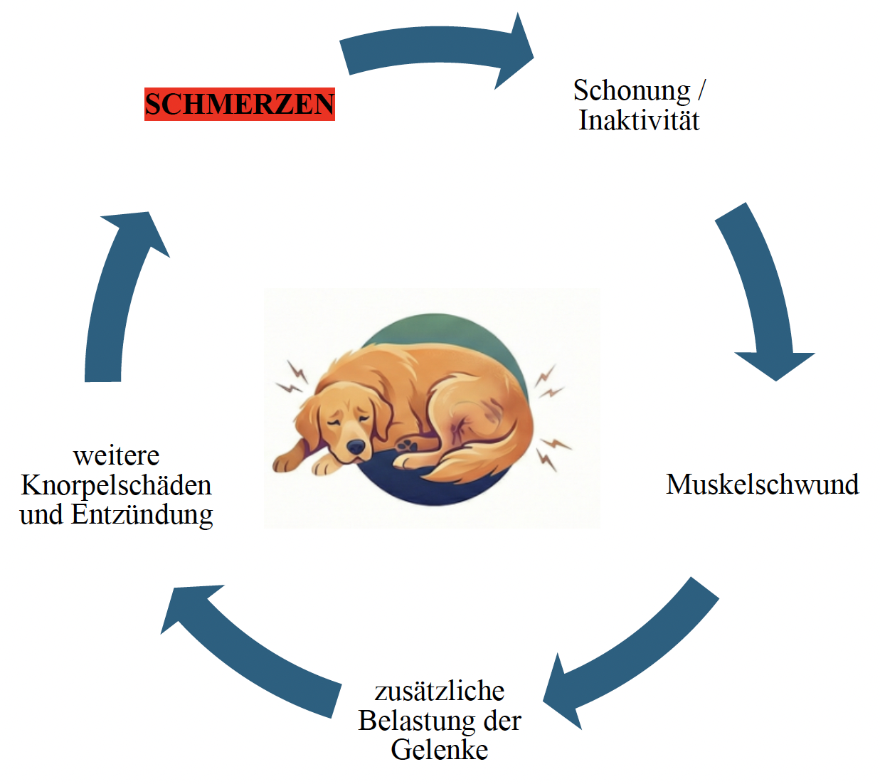 Ein Gelenk, das durch Arthrose schmerzt, wird vom Hund automatisch geschont. Er bewegt sich weniger, um den Schmerz zu vermeiden. Durch diese Inaktivität baut sich jedoch nach und nach die Muskulatur ab. Schwächere Muskeln stabilisieren das betroffene Gelenk nicht mehr ausreichend, wodurch die Belastung auf Gelenkkapsel, Knorpel und Bänder steigt. Das führt zu weiterem Knorpelschaden und neuen Entzündungen. Die Schmerzen nehmen wieder zu – und der Kreislauf beginnt von vorne.
